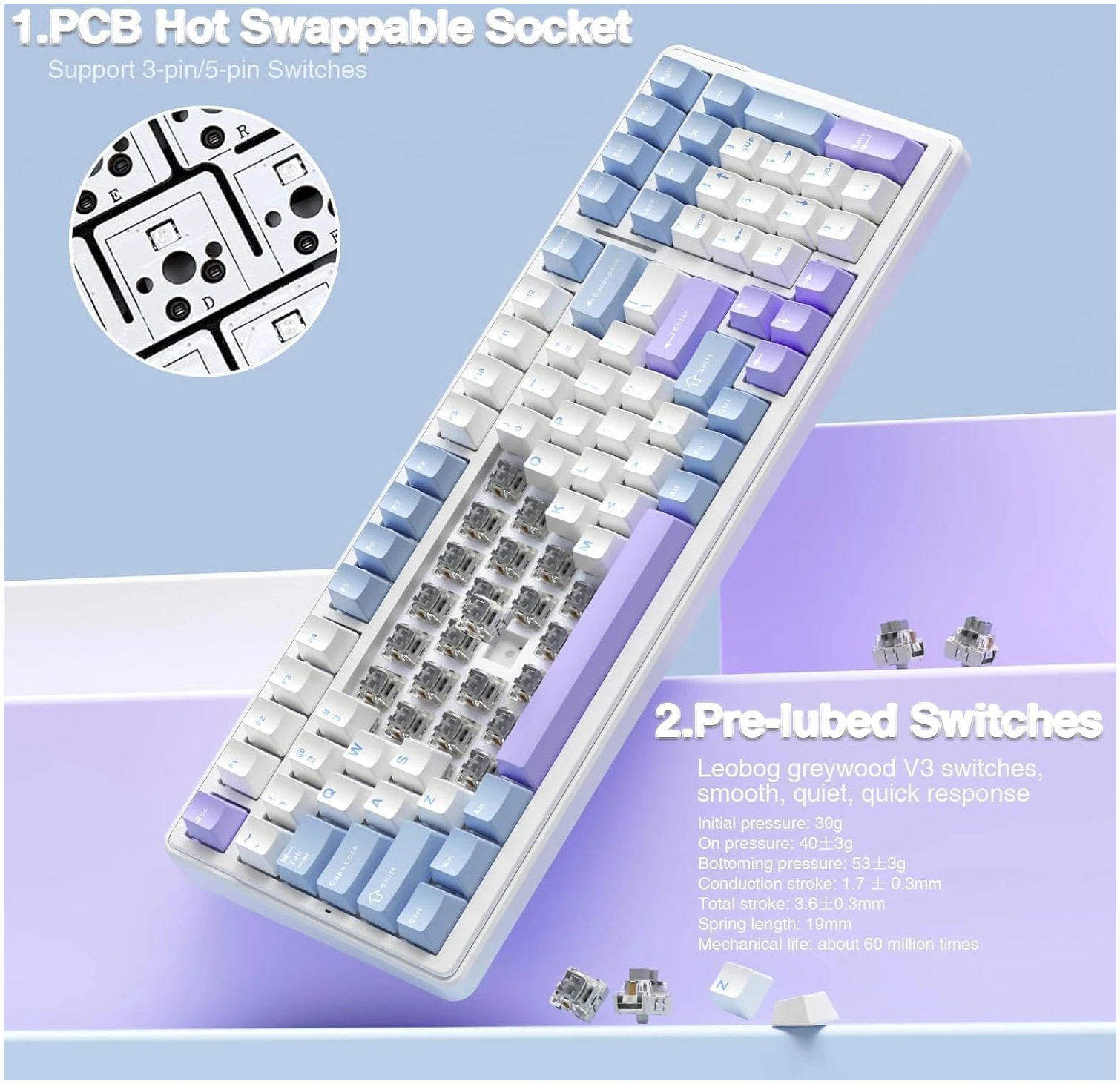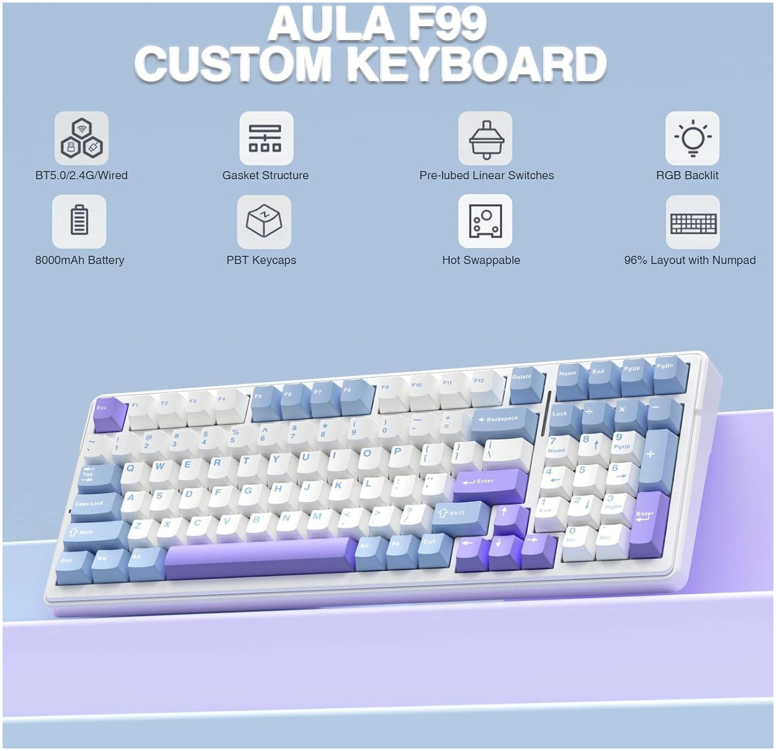 Customization is key when it comes to mechanical keyboards, and the AULA F99 excels in this area. Its hot-swappable PCB allows you to easily replace the switches and keycaps without any soldering, offering you the freedom to tailor your keyboard to your liking. Whether you prefer the tactile feedback of a clicky switch or the smooth press of a linear switch, the pre-lubed linear switches included provide a satisfying typing experience right out of the box. The keyboard comes with a keycap and switch puller, making the customization process seamless and user-friendly.