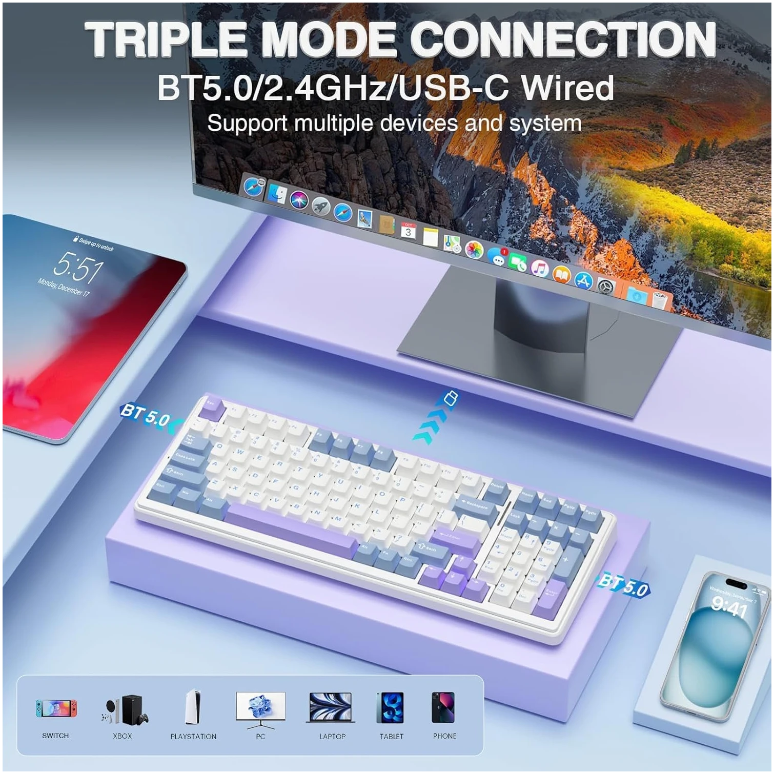 One of the standout features of the AULA F99 is its multi-device connection capability. With three distinct modes of connectivity—Bluetooth 5.0, 2.4GHz wireless, and USB-C wired mode—you can seamlessly connect to various devices. Whether you’re gaming on your PC, working on your tablet, or simply typing on your console, this keyboard has you covered. The ability to connect to up to five devices simultaneously and switch between them effortlessly using the FN key combination ensures that your workflow is smooth and uninterrupted.