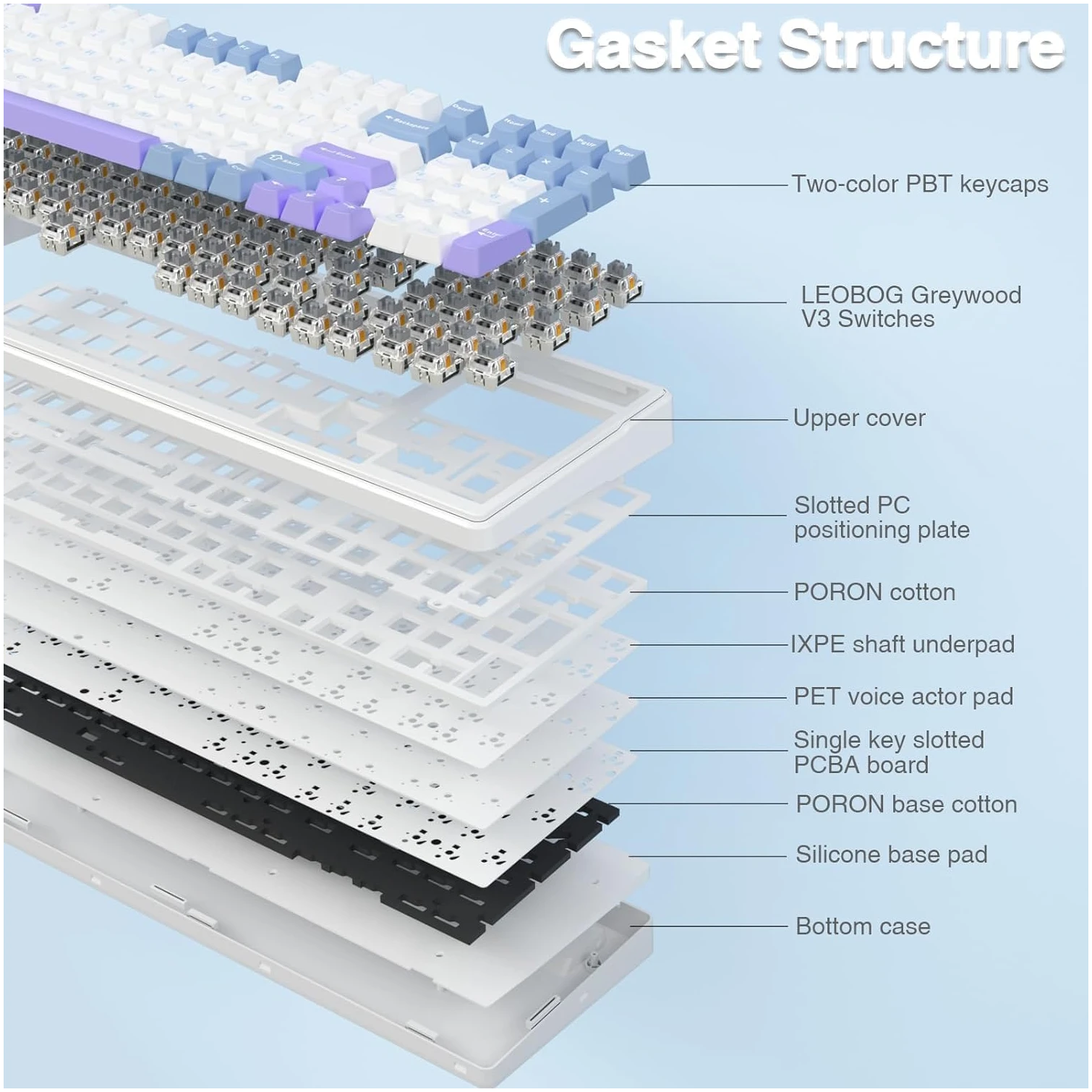 A: The gasket structure enhances the keyboard’s resilience and stability, providing a softer and more elastic typing feel. It also minimizes noise from the switches, making for a more pleasant typing experience.